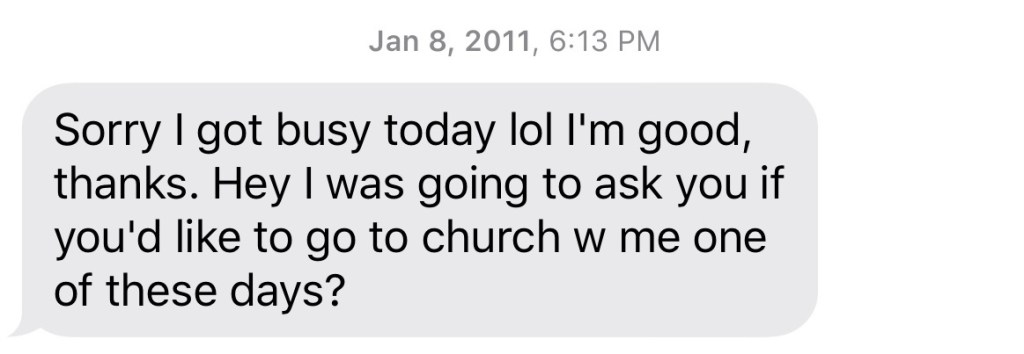 Later that day, after I got dad home, and I got home myself and once again began to break down and cry out for help. I distinctly recall, sobbing “I can’t do this on my own, I need someone to help me.” No sooner had I finished that sentence, than my phone buzzed, it was my friend texting back, you can see he screenshot of that text here. Simply put, my friend invited me to church.